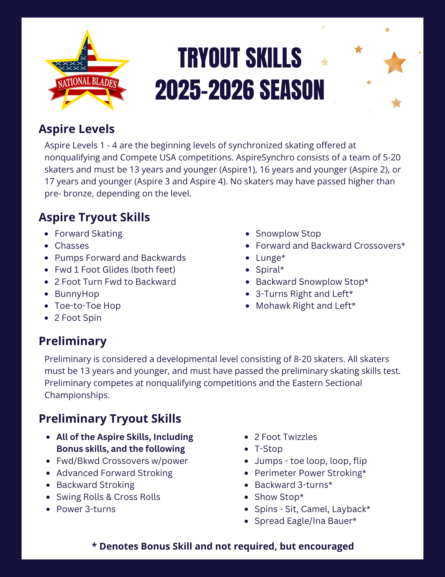 Skaters are evaluated and placed on teams according to their skating skills displayed at tryouts, past synchro experience, USFS tests and age requirements determined by USFS for specific team levels. Skaters should expect to know their tentative team placement by March 30th, 2025. Skater team commitment contracts must be signed and returned with appropriate commitment fees by April 2nd, 2025.