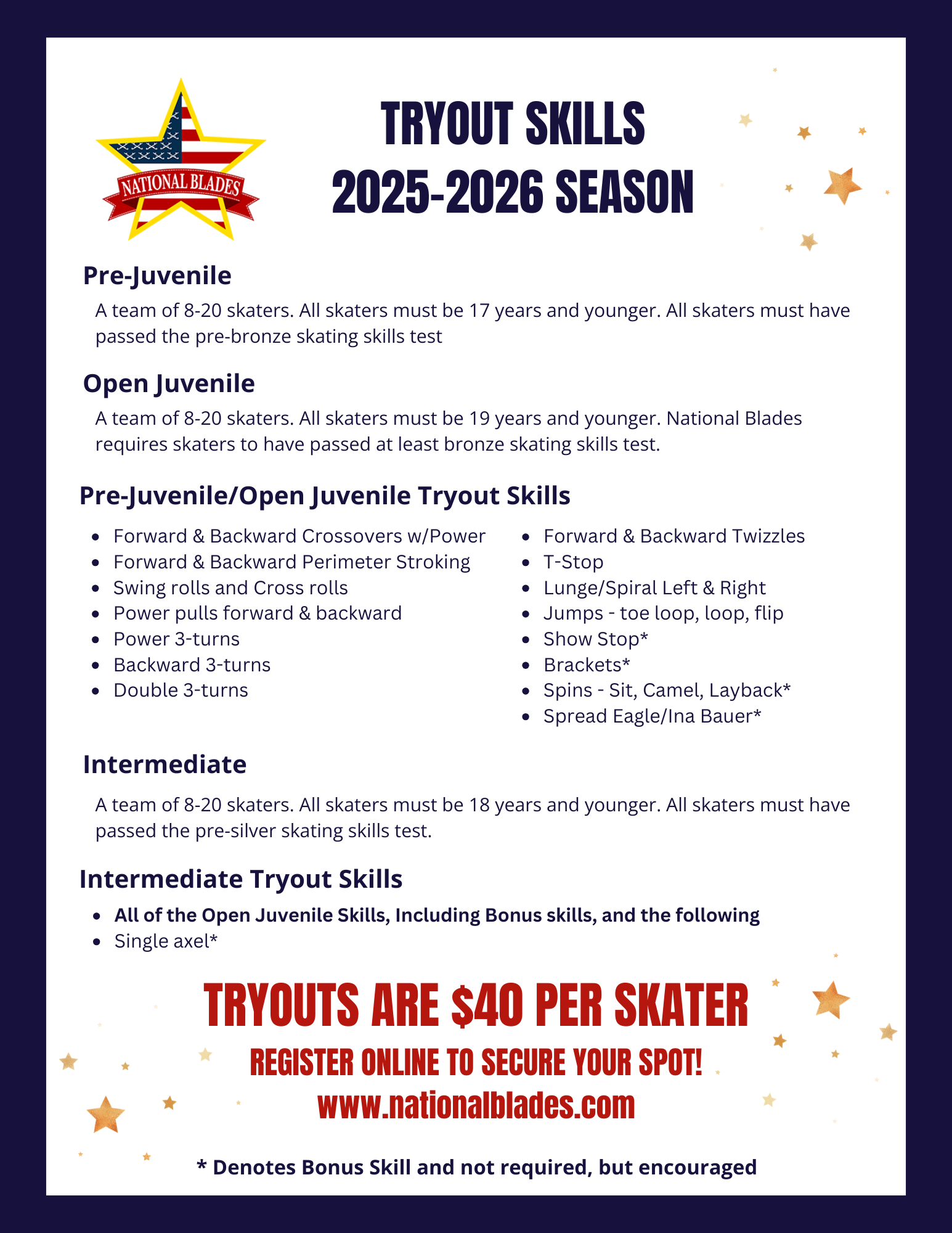 The National Blades 2025-2026 Tryouts will be held on March 16th, 2025 and March 30th, 2025. Please see our registration page to register for tryouts at the appropriate time and date for your skating skills level. Team placement will be announced by March 30th 2025, and team commitments are expected by April 2nd, 2025.